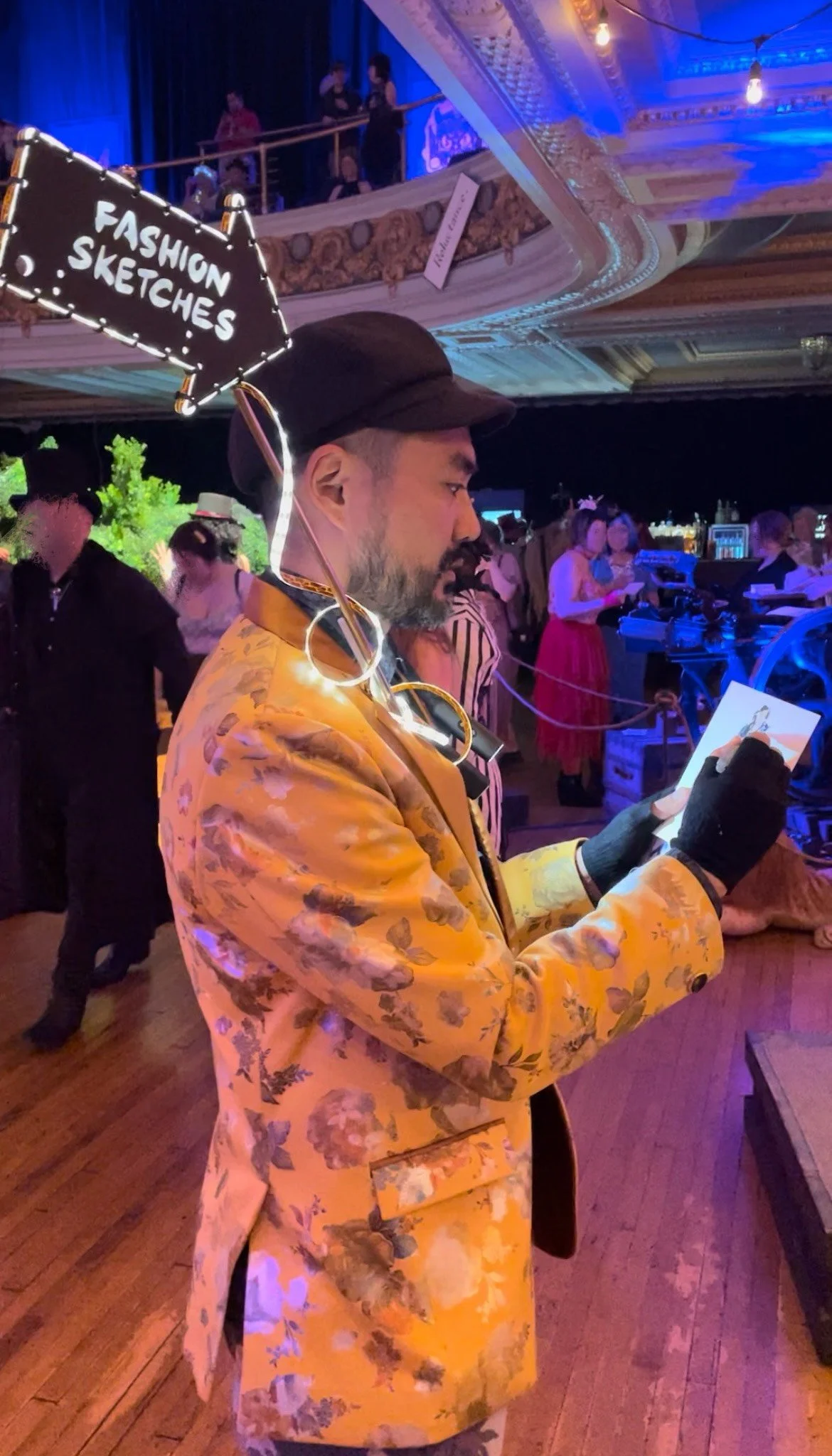 Find Edi wandering the Ball with his lovely assistant, offering bespoke sketches of your fabulous attire, drawn on the spot in a few minutes. You can purchase portraits from Edi directly, just look for the Fashion Sketches arrow sign!